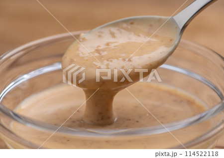 木目のテーブルの背景に胡麻ダレと白ゴマの真俯瞰