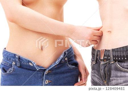 ウエストやお腹周りに手を当てる若い女性 顔無し