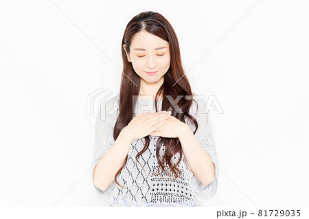 白い背景の前で、胸に手を当てる若い女性