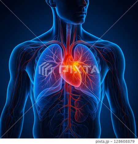 AI generated hyper detailed sci fi visualization of male upper body respiratory and cardiovascular systems glowing with biometric energy on dark background