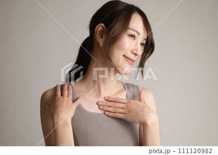 鎖骨を押さえる若い女性・リンパマッサージ・胸鎖乳突筋