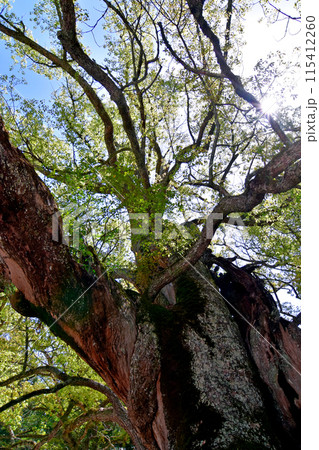 四国5月の景色 天然記念物大山祇神社楠群の一つ「乎千命御手植の楠」 枝の間から覗く快晴の青空と日光