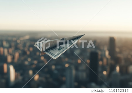Paper Plane Made of Dollar Bills Soaring Above Cityscape