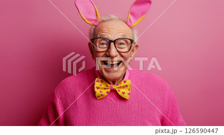 Elderly Man in Bunny Ears Laughing on Pink Background