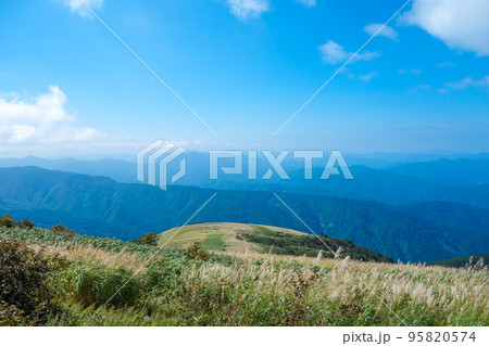 秋の部子山 能楽の里牧場跡からのススキと夕方の眺め 福井県今立郡池田町