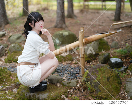 鹿おどしでひらめいた女性
