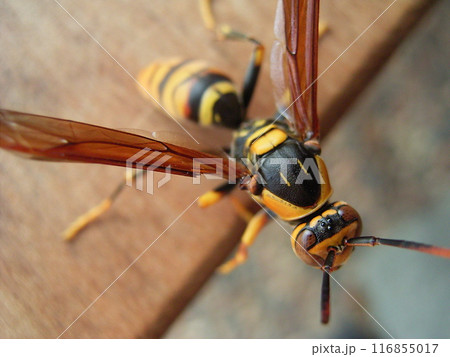 脚の縦模様が鮮やかで踏切の遮断機なみのキアシナガバチ