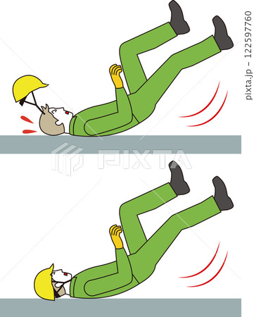 現場作業の危険な場面。スリップしてヘルメットが脱げた作業員のイラスト