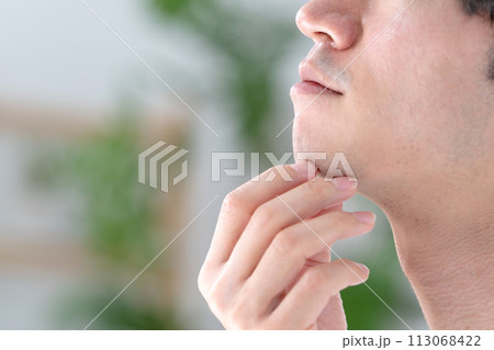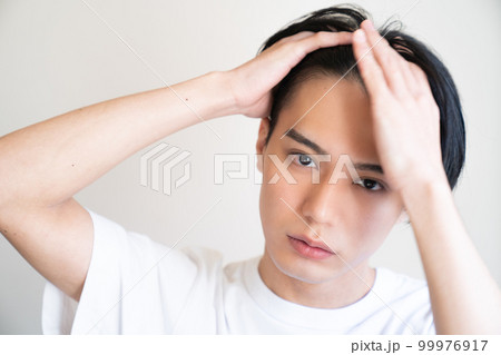 肌の綺麗な男性 ポートレート 美髪 脱毛 ヒゲ 白Tシャツ かっこいい かわいい センターパート