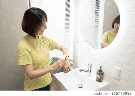 ビューティ 鏡の前でメイクをするショートヘアのミドル女性