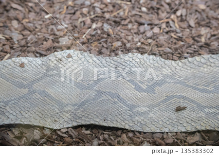 Detailed Close-up of Shed Grass Snake Skin on Mossy Weathered Wood