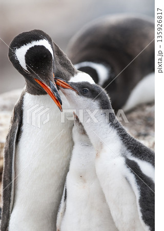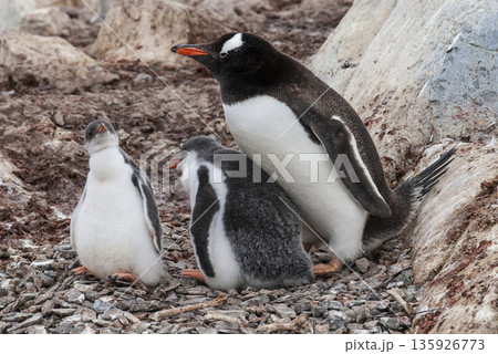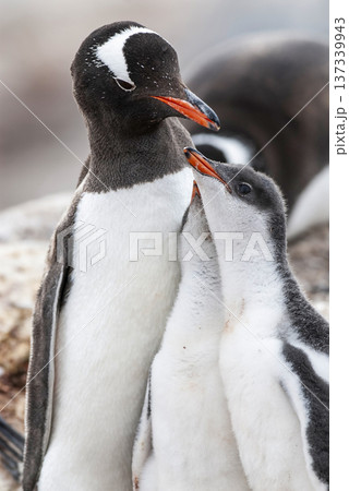 Gentoo Penguin on the beach,feeding his chick, Port Lockroy , Goudier Island, Antartica