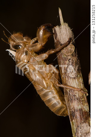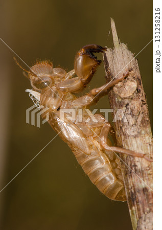 Cicada insect stick on tree. Macro cicadas molting. Insect molting cicadas on tree in nature. Cicadas metamorphosis