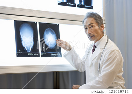 頭部のレントゲン写真を見ながら説明するベテランの医師