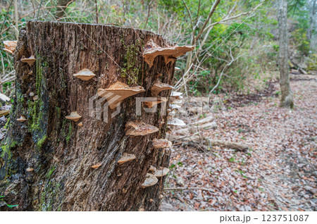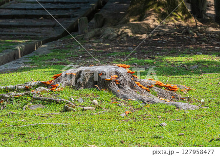 切り株に生えるキノコ(ヒイロタケ) 奈良公園荒池園地