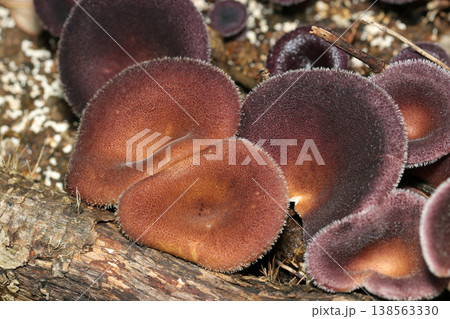 日本の春、倒木に紫色と茶色のアラゲカワキタケ茸幼菌が生える自然風景(自然環境下茸マクロ撮影)