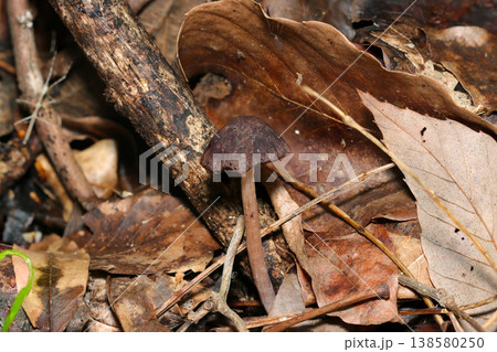 日本の春、こげ茶色のウスベニイタチタケが一本林床にたつ(自然環境下菌・キノコ類マクロ撮影)