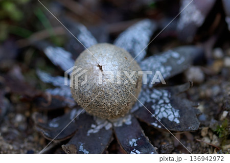 老成したオニフスベ茸のひび割れて剥がれ落ちる外皮アップ画像(自然環境下キノコマクロ写真)