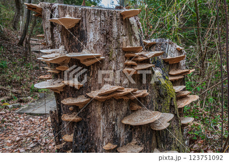 切り株に生えるキノコ(ヒイロタケ) 奈良公園荒池園地