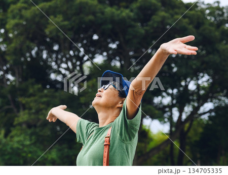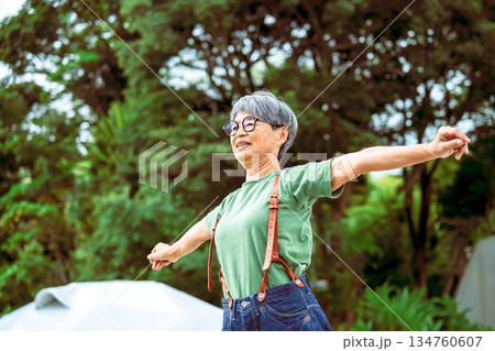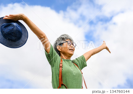 屋外で腕を広げる高齢女性 【撮影協力:隠岐シ