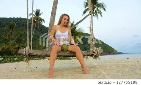 Attractive woman is swinging on a swing. Sexy hot erotic bad girl posing on the beach against the backdrop of the sea.