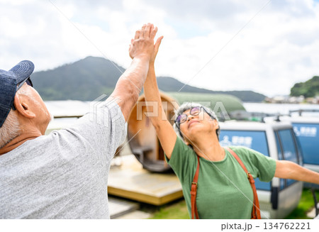 高齢夫婦が屋外で体操 【撮影協力:隠岐シーサイドリゾートみやび様】