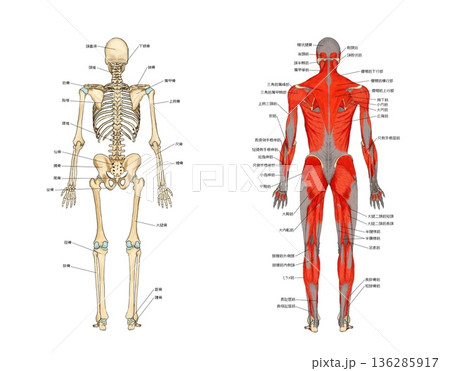 後から見た骨格と筋肉モデル