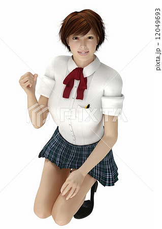 笑顔でしゃがむ女子高生 3DCG イラスト素材