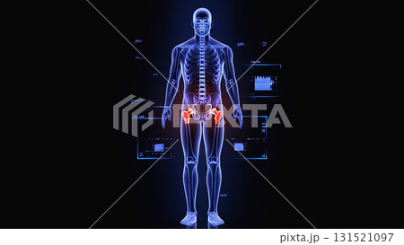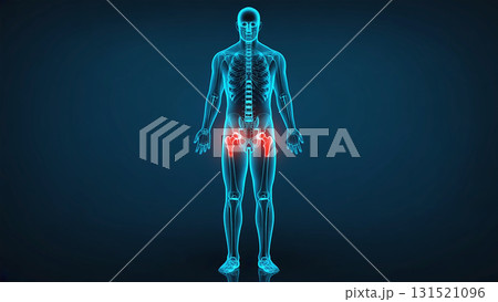 3D medical illustration of a human skeleton with highlighted spine and joints. Generative AI.