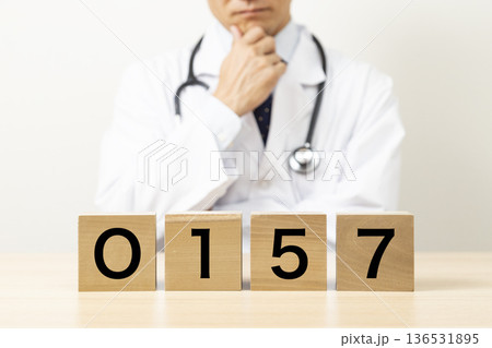 「O157」と書かれたブロックと悩む医師