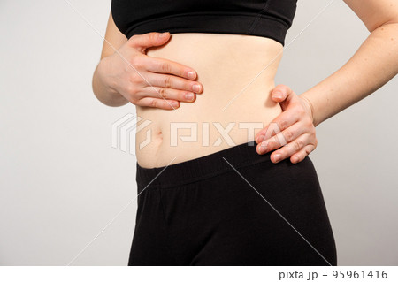 Woman having Stomach pain. Ovarian and Cervical cancer, Cervix disorder, Endometriosis, Hysterectomy, Uterine fibroids, Reproductive system, menstruation, diarrhea and Pregnancy concept