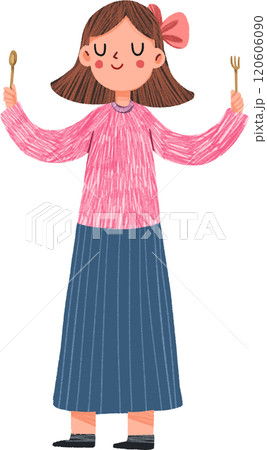 Relaxed Smiling with Bow Holding Spoon and Fork, hand-drawn digital painting illustration