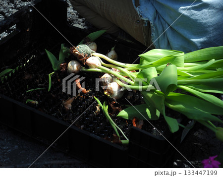 Tulip bulb garden planting spring crate harvest, peaceful mood during outdoor work in soil with fresh green leaves and bulbs