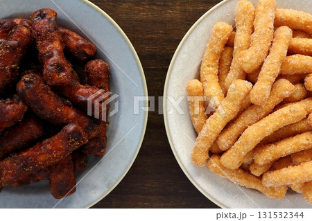 白背景の黒かりんとう(黒糖かりんとう)と白かりんとう