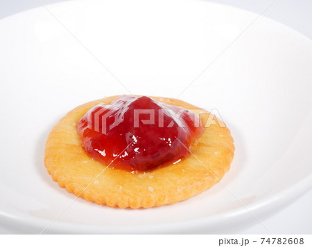 いちごジャムを乗せた丸いクラッカー