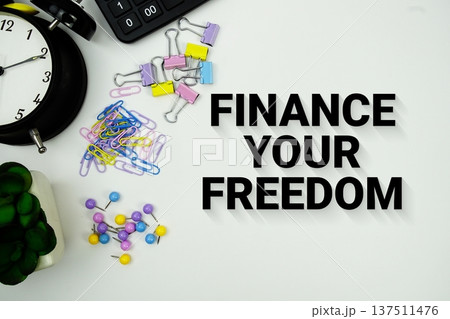Finance Your Freedom message with calculator, alarm clock and Stationery on white background