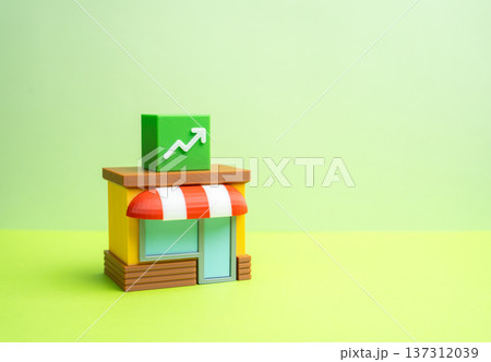 Miniature stores and arrow up and down. Concept of report, review and audit, financial indicators of business. Profit, income and profit analysis. franchise and competition