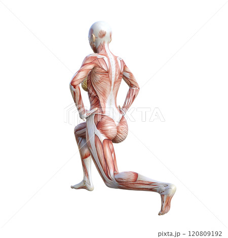 筋肉解剖図の女性がスプリットスクワットストレッチをする横向き全身3Dイラスト