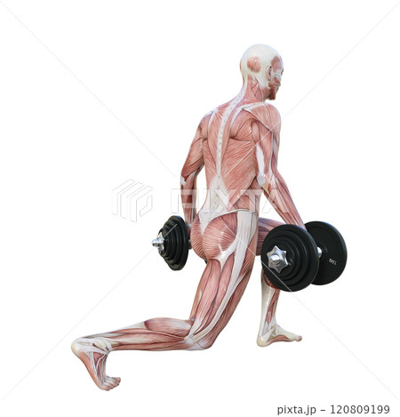 筋肉解剖図の男性がダンベルでスプリットスクワットをする後ろ向き3Dイラスト