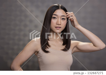 Asian model with soft skin and natural glow being graceful in the studio, showing a serene expression that represents empowerment and the gentle beauty of natural beauty. Feminine girl.