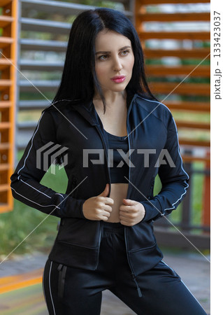 athletic brunette girl stands outside wearing black sportswear. She showcases an active lifestyle while looking poised and focused. The background features colorful outdoor structures.