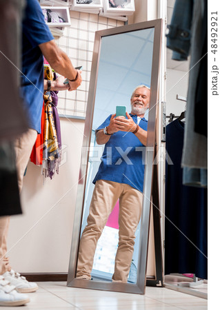 Positive elderly man making selfies in front of shopping mirror