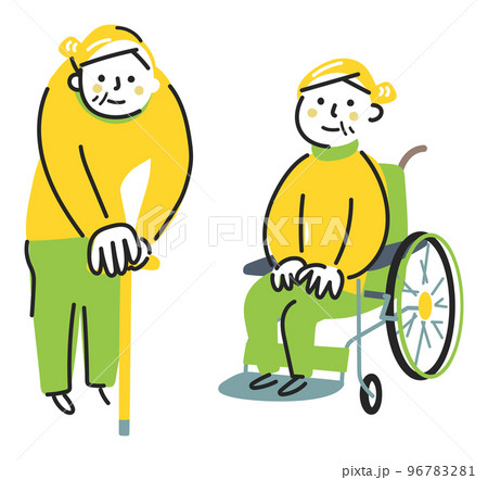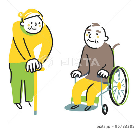 杖をついているお祖母ちゃんと車椅子に座るお祖母ちゃん シニアライフ イラスト素材