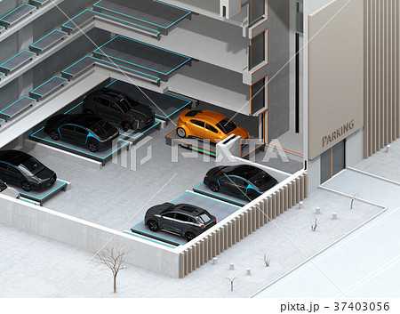 自動搬送ロボットAGVがクルマを駐車スペースに搬送している。自動駐車システムのコンセプトイメージ