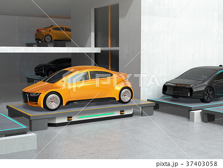 自動搬送ロボットAGVがクルマを駐車スペースに搬送しているグレイシェーディングイメージ。