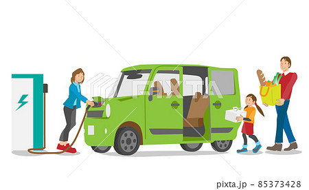 電気自動車の充電と買い物を役割分担する家族