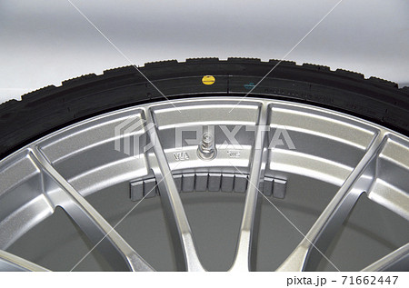 高性能な乗用車に装着する幅の広い冬用タイヤを軽量で剛性の高いアルミホイールに組付けた状態の外観