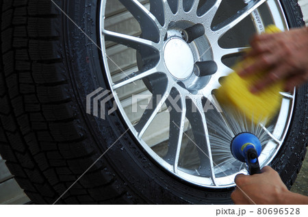 冬タイヤのホイールの表側を手作業で丁寧にシャワーとスポンジで水洗いしている光景