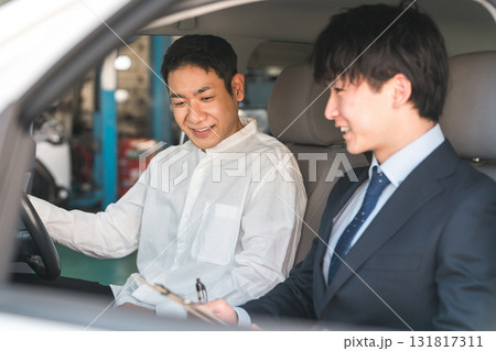 車の修理・点検・整備・メンテナンスをするディーラーの作業着を着た男性整備士と営業のスタッフ