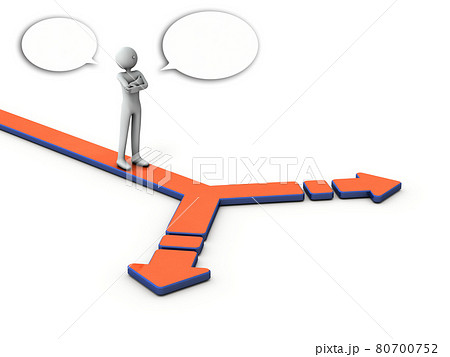 岐路で自問自答する人物。白バック。3Dレンダリング。